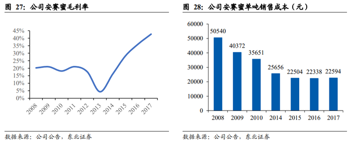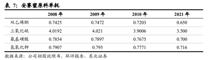 沧海横流方显英雄本色,安赛蜜价格周期底部更为凸显公司强大成本控制能力。在竞争加剧、价格下滑的下行周期,具备成本控制能力的企业竞争力将更为明显,高成本企业的市场份额将被逐步蚕食甚至被迫退出市场,这在安赛蜜市场此前的低价竞争时期已得到充分验证。2008-2017年,通过技术改进与原料配套自给等多方面发力,公司安赛蜜单吨销售成本从5.05万元/吨大幅降至2.26万元/吨。从根据公司公告,2016-2017年公司安赛蜜单吨销售成本为2.23万元/吨、2.26万元/吨,同期安赛蜜单价为3.50万元/吨、3.94万元/吨,公司在不到4万元单价水平下仍保持40%左右的高毛利水平。至2021年,双乙烯酮等主要原料单耗已有效降低,彰显了公司强大的技术改进与成本控制能力。