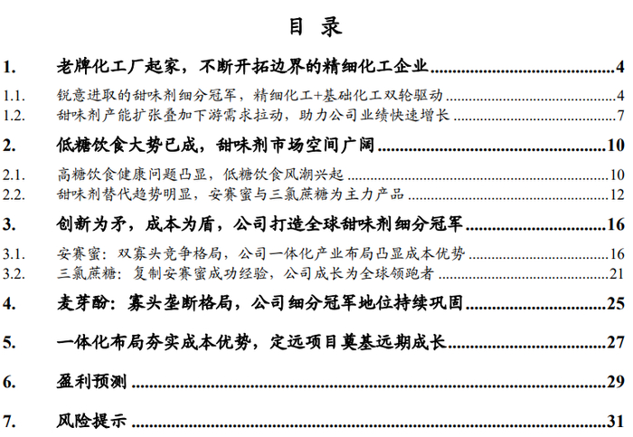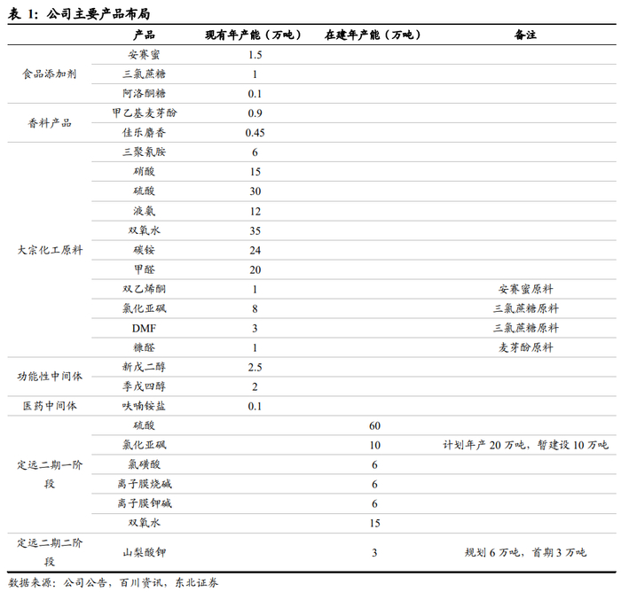 公司主要产品为食品添加剂、大宗化工原料、功能性中间体与医药中间体。目前公司食品添加剂分为甜味剂和香料产品,广泛用于下游食品饮料、医药原料、化妆品等。公司拥有安赛蜜1.5万吨/年产能、三氯蔗糖1万吨/年产能、麦芽酚0.9万吨/年产能,三个产品均做到全球产能规模第一地位。大宗化学品包括液氨、双氧水、三聚氰胺、硫酸、硝酸、双乙烯酮、氯化亚砜等,大宗化工产品有效保障了食品添加剂产品的原料供应安全与成本优势,是公司产品竞争优势的基石所在。