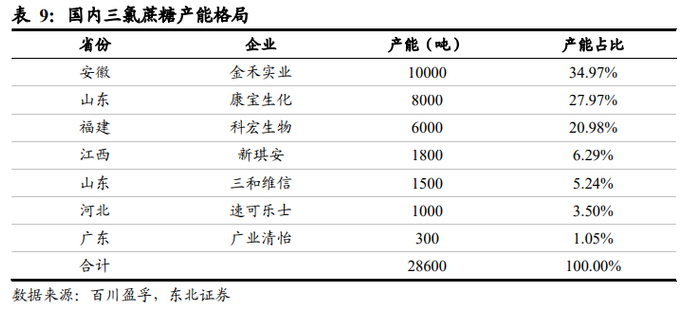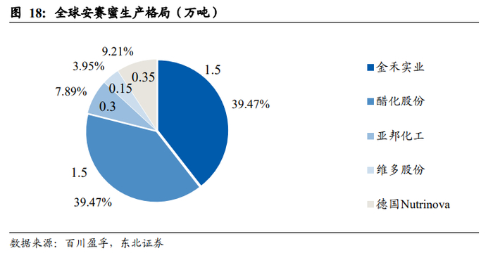 全球安赛蜜产能集中于中国,市场呈金禾实业与醋化股份双寡头垄断格局。据百川资讯,2023年我国仅有金禾实业、醋化股份、山东亚邦与江苏维多四家安赛蜜生产商,其中金禾实业作为头部厂商拥有1.5万吨年产能,深耕安赛蜜行业十余年,生产工艺成熟,经验积累深厚;醋化股份拥有1.5万吨年产能,已于2023年5月底进入正式生产阶段;山东亚邦与江苏维多分别具备0.3万吨与0.15万吨年产能,规模相对较小。海外仅德国Nutrinova具备0.35万吨安赛蜜年产能,其产品定位高端,与国内厂商竞争关系较弱。