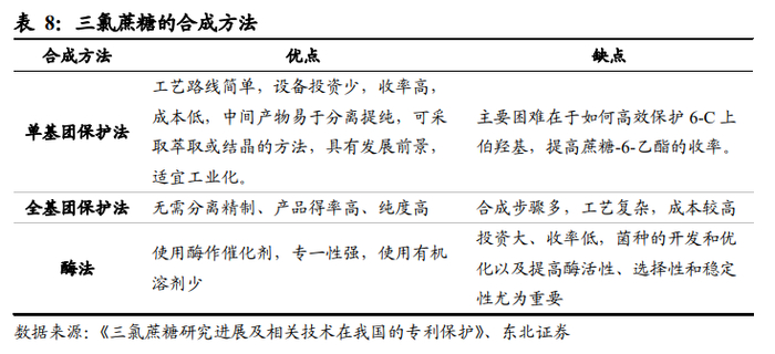 三氯蔗糖合成方法分为单基团保护法、全基团保护法与酶法,单基团保护法为主流方法。全基团保护法因合成步骤太过冗长而不具备工业应用价值,单基团保护法仅保护6-羟基,三步即可完成合成,大大简化了合成步骤与操作过程。单基团保护法根据中间体制备方法不同可分为直接酯化法、二丁基氧化锡法、原乙酸三甲酯法。酶法利用酶的专一性将糖类物质中6-羟基保护后,经过氯化等步骤得到三氯蔗糖。