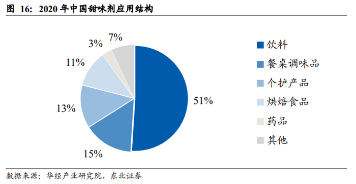 甜味剂下游应用广泛,饮料为其最大应用领域。甜味剂已在饮料、餐桌调味品、个人护理用品、烘焙食品、药品等领域对糖类进行替代,饮料为甜味剂最大应用,占比约51%,餐桌调味品与个护产品占比分别为15%和13%,分居第二、三位。