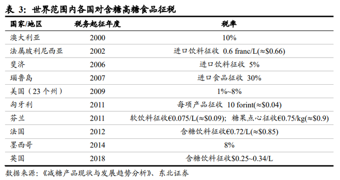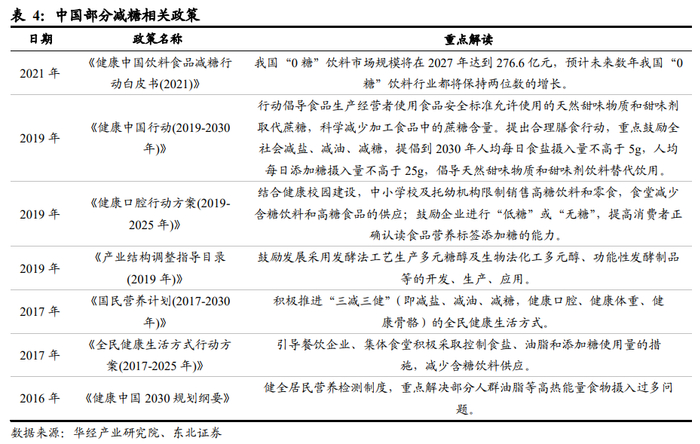 为降低国民糖分摄入、保障居民健康,多国已制定实施控糖减糖政策。随着高糖高热量饮食的摄入,糖尿病、肥胖及龋齿发病率不断上升,对人们的健康产生不利影响。欧美及澳洲等人均食糖消费较高的国家和地区,很早以前就开始关注过多摄入食糖的潜在危害,已将降糖提升到国家强制管控层面。为了降低食糖的人均消费,这些国家政府部门自2000年后陆续开始对含糖食品和饮料征税,逐步制定和颁布针对糖领域食品的征税政策。我国亦陆续出台控糖减糖政策,推动居民健康生活,在《健康中国行动(2019-2030)》发展规划提出合理膳食行动,重点鼓励全社会减盐、减油、减糖,提倡到2030年人均每日添加糖摄入量不高于25g。