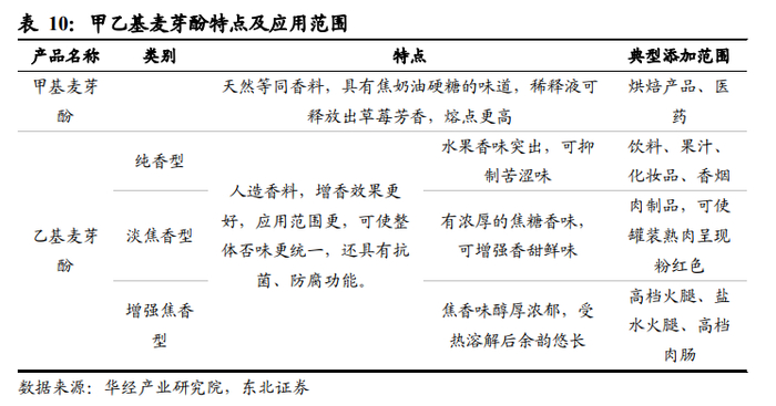 麦芽酚主要分为甲基麦芽酚和乙基麦芽酚,是一类广谱的的香味增效剂,具有增香、固香、增甜的作用。甲基麦芽酚可用于生产医药中间体,包括吡啶盐和胃药泮托拉唑。乙基麦芽酚根据其特色可分为纯香型、焦香型、特醇型,常作为食品增香剂添加与烘焙食物、冰淇淋、化妆品、烟草、饮料和糖果中。