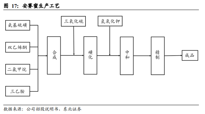 3.1.安赛蜜:双寡头竞争格局,公司一体化产业布局凸显成本优势安赛蜜是应用广泛的第四代甜味剂。安赛蜜又称为乙酞磺胺酸钾、AK糖,1967年由德国人卡尔克劳斯发明,为第四代甜味剂。从1988年开始安赛蜜作为一种低热量甜味剂被允许使用,其口味与蔗糖类似,甜度约为蔗糖的200倍。安赛蜜口味清爽甜味感觉迅速没有不良口感,由于其不在人体内代谢可随尿液排出体外,因此热量极低,是理想的甜味剂之一。安赛蜜还具有高稳定性,能耐受225℃的高温,在pH处于2-10范围内保持稳定,不与食品内其他成分发生反应。由于安赛蜜具有优越的综合性能,已被广泛应用于食品饮料、医药、化妆品等多个行业。氨基磺酸-三氧化硫法为安赛蜜主流合成方法。首先用氨基磺酸在三乙胺作催化剂下与双乙烯酮缩合反应生产乙酰氨基磺酸,用三氧化硫脱水磺化,再用氢氧化钾中和制得安赛蜜,经浓缩、脱色、结晶、烘干得成品。