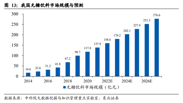 控糖需求拉动无糖饮食快速发展,促进甜味剂市场持续增长。随着各国对糖分超量摄入问题逐渐重视,健康低糖饮食观念在居民中开始普及,低糖/无糖食品饮料市场逐步兴起。根据中国科学院数据,国内无糖饮料市场规模在过去几年间保持高速增长,自2014年的16.6亿元增长至2020年117.8亿元,CAGR达38.62%,预计到2025年增长至227.4亿元,规模将再翻一番。无糖饮料的快速发展,将有力促进甜味剂市场规模增长。