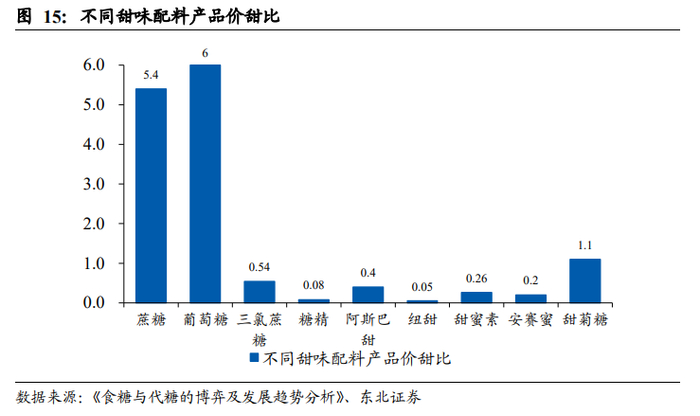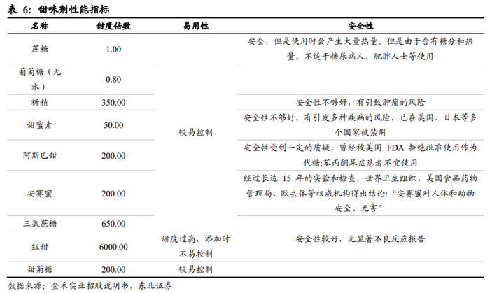 决定甜味剂性能的主要因素是价甜比、安全性与易用性,三氯蔗糖与安赛蜜综合性能强。相较于蔗糖,人工甜味剂成本低。通常情况下甜味剂的性价比以价甜比衡量,定义蔗糖甜度为1,而为了实现相同的甜度人工甜味剂的成本不到蔗糖的10%,故人工甜味剂可大幅降低生产成本。三氯蔗糖、安赛蜜等新型甜味剂在价甜比上优势明显,市场空间广阔。三氯蔗糖、安赛蜜与纽甜具有较好的安全性,但纽甜由于甜度倍数过高,添加时不易控制,易用性相对较差。