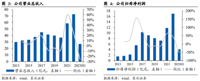 2014-2022年,公司业绩规模大幅扩张。2013-2022年,公司营收自29.77亿元增长至72.50亿元,CAGR为10.40%;归母净利润自1.46亿元增长至16.95亿元,CAGR为31.31%。2017-2020年,受剥离华尔泰子公司、化工行业景气度回落,大宗化学品价格持续低迷等影响,公司业绩出现一定程度下滑。2021-2022年,在公司甜味剂产能持续扩张叠加下游需求快速增长的双重驱动下,公归母净利润自7.19亿元快速增长至16.95亿元。2023H1主要甜味剂价格周期下行致使盈利空间压缩,致使公司业绩出现下滑。
