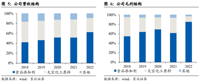 公司主营业务为食品添加剂和大宗化学原料两大板块,食品添加剂为毛利主要来源。公司甜味剂和香料产品,广泛用于下游食品饮料、医药原料、化妆品等,为公司收入利润主要来源。2018-2022年,公司营收以食品添加剂占比最高,增长幅度较大,自42.42%增长至62.86%。毛利方面,食品添加剂为第一大占比产品。2022年,食品添加剂毛利占比为85.38%。