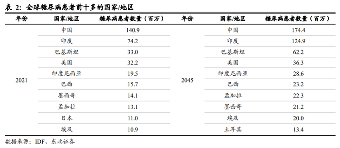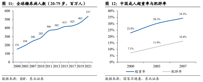 全球肥胖与糖尿病健康问题凸显,中国居民超重/肥胖率持续上升。根据国际糖尿病联盟(IDF)数据,2021年全球约5.37亿成年人(20-79岁)患有糖尿病,预计到2030年,该数字将上升到6.43亿;到2045年将上升到7.83亿。在此期间,世界人口估计增长20%,而糖尿病患者人数估计增加46%。中国是全球糖尿病患者最多的国家,约有1.41亿人患病。根据国家卫健委《中国居民营养与慢性病状况报告(2020年)》数据,近20年来我国成人超重率与肥胖率持续增长,至2020年我国成年居民超重率和肥胖率分别达到了34.3%和16.4%。