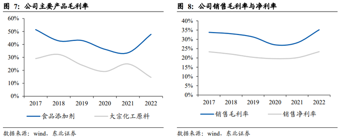 公司整体盈利水平波动中提升。2022年公司食品添加剂、大宗化工原料产品毛利率分别为47.77%、14.56%,其中食品添加剂作为公司主要盈利来源,毛利水平较2021年有较大提升,大幅提升14.20个pct。2017-2022年,公司销售毛利率自33.79%增长至35.17%,增长1.38个pct;销售净利率自23.31%增长至23.37%,增长0.06个pct,整体盈利能力在波动中提升。