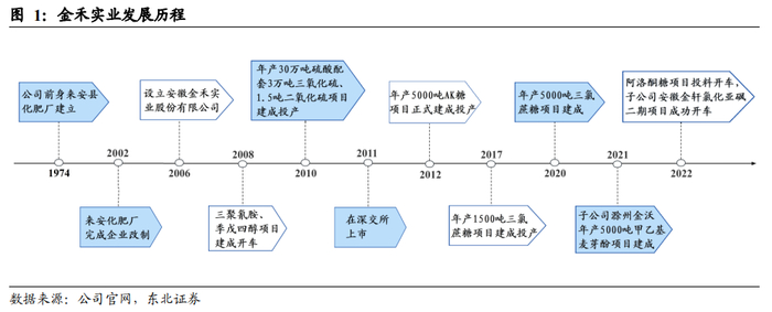 公司老牌化工厂起家,精细化工+基础化工双主业协同发展。安徽金禾实业股份有限公司创建于1974年,其前身为来安县化肥厂,2002年完成企业改制,2006年改组成立股份有限公司,并于2011年在深交所上市。公司总部位于安徽省滁州市,拥有来安和定远两大生产基地;主营业务为食品添加剂、大宗化工原料等,分属于精细化工行业和基础化工行业。公司从基础化工业务起步,依托技术积累和产业链优势,逐步拓展至精细化工领域,形成“双主业”协同发展良好格局,实现化工产品良性循环。