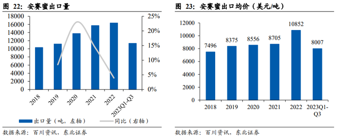 我国安赛蜜生产以出口为主,海外需求有效拉动出口增长。2018-2019年,我国安赛蜜出口量约1.0-1.1万吨,保持相对稳定;2020年起,受海外甜味剂需求提升拉动,安赛蜜出口迅速增长,至2022年出口1.64万吨,2018-2022年安赛蜜出口量CAGR为12.21%,增长明显。价格方面,2018-2022年,安赛蜜出口均价自0.75万美元/吨增长至1.09万美元/吨,2023年前三季度,受国内安赛蜜价格中枢下移影响,出口均价回落至0.80万美元/吨。