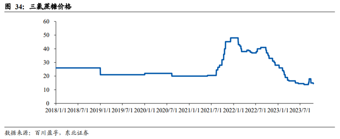三氯蔗糖当前价格已至底部位置,有望推动行业产能出清。2018-2021上半年,三氯蔗糖价格总体稳定在20-25万元/吨区间,价格总体波动较小。2021年下半年以来,由于能耗双控带来国内化工产品价格普涨,三氯蔗糖原料氯化亚砜与DMF价格大幅上行,叠加海外需求旺盛,三氯蔗糖价格自20万元/吨快速走高至年底的约48万元/吨,此后直至2022年三季度末,价格中枢保持在40万元/吨左右的景气高位。自2022年四季度起,受海外需求低迷、原料成本支撑不足等影响,价格持续走低,截至2023年11月,市场价格约15万元/吨,已达底部位置,贴近生产成本线,景气下行周期下高成本厂家持续承压,有望推动行业产能进一步整合,提升公司市占率。