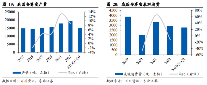 我国安赛蜜产量持续增长,国内消费水平仍有增长空间。据百川资讯,2017-2022年,我国安赛蜜产量自1.47万吨增长至1.92万吨,CAGR为5.49%。在2020年以后,受海外需求拉动影响,安赛蜜开工水平连续保持高位,在较长时间段内均位于90%以上。受国内与海外消费习惯差异影响,国内安赛蜜以出口为主,表观消费水平较低,2019年表观消费量为3843吨,2022年为2905吨,有所下滑。2023年前三季度国内安赛蜜表观消费量为2751吨,已接近2022年全年水平,但消费量仍明显低于出口量。随着居民健康生活理念普及与代糖餐饮市场拓张,国内安赛蜜消费水平有望进一步提升。