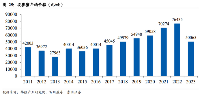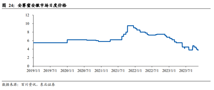 当前安赛蜜价格已进入历史低位水平。2019年以来,随着江苏浩波与江西北洋安赛蜜产能停产,叠加下游无糖饮料市场需求增长,安赛蜜市场格局好转。以安赛蜜安徽市场价为例,据百川资讯,2019年均价为5.5万元/吨,2020-2021H1价格中枢稳定于约6万元/吨。2021年下半年以来,受化工市场原料价格普涨影响,安赛蜜原料双乙烯酮价格走强,在成本支撑下安赛蜜价格快速上涨至2021年底约9.5万元/吨。2022年以来,在原料价格回落叠加醋化股份安赛蜜新增产能开始试车,安赛蜜价格整体下行,至2023年11月已回落至3.8万元/吨,当前安赛蜜价格已处于历史低位水平