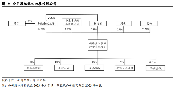 公司实控人为杨迎春先生和杨乐先生父子,决策权集中保障长期战略稳定。公司控股股东为安徽金瑞投资集团有限公司,实际控制人为杨迎春先生和杨乐先生,二人系父子关系,为一致行动人。杨迎春为安徽金瑞投资集团董事长,通过直接与间接方式合计持有公司11.61%股权。杨乐为上市公司金禾实业董事长,通过金瑞投资间接持有公司10.26%股权。公司决策权相对集中,有力保障公司发展长期战略稳定。公司拥有金轩科技、金沃生物等多家全资或参控股子公司,与母公司分块实施精细化工、基础化工各产品业务生产销售,业务格局清晰。