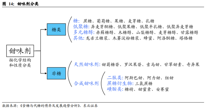 甜味剂甜度高、热量低,是蔗糖的优良替代品。甜味剂是一类仅需少量使用即可赋予食品甜味,但几乎不产生能量的一类物质。根据甜度划分,甜味剂可分为高倍甜味剂与低倍甜味剂;根据来源划分,可分为人工甜味剂与天然甜味剂。其中人工合成甜味剂与天然甜味剂又合成为功能性甜味剂。随着人们生活水平提高,糖分摄入水平已超出日常需要,并带来高血糖、肥胖以及糖尿病等严重的健康问题。甜味剂由于甜度远高于蔗糖且热量极低,成为了蔗糖等糖类的优良替代品。
