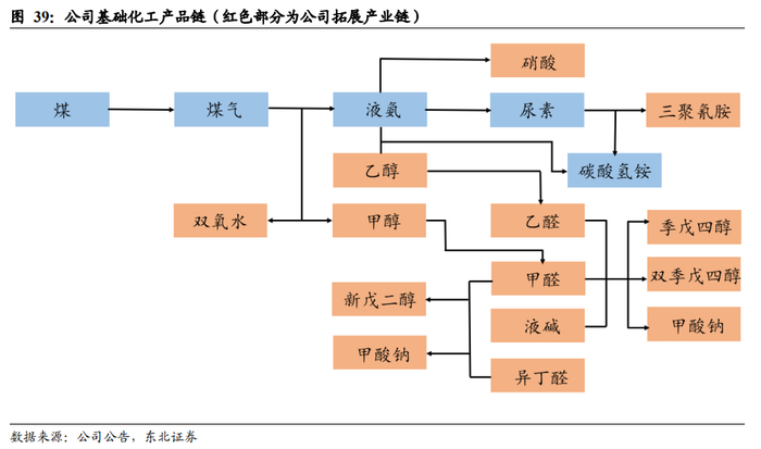公司以传统氮肥产品为基础,拓展延伸基础化工产业链。传统氮肥生产企业通常只涵盖以煤为原料,生产液氨、碳酸氢铵、尿素的生产流程。公司基础化工产品业务在传统化肥产品为主导的基础上,不断摸索改进提升产品工艺,拓展产品布局,目前已形成了集化肥产品、其他基础化工产品、精细化工产品等多元产品于一体的布局,产品矩阵丰富。公司生产的基础化工产品主要为液氨、碳酸氢铵、三聚氰胺、甲醛、硫酸、硝酸、新戊二醇等。