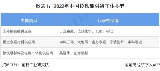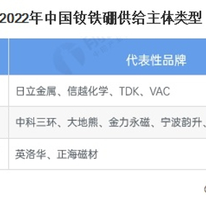 从中国钕铁硼材料供应主体类型来看,钕铁硼材料产品供应主体主要包括以以日立金属、信越化学、TDK为代表的国外厂商;中科三环、大地熊、金力永磁、宁波韵升、中科磁业为代表的专业稀土永磁材料供应商,以英洛华、正海磁材为代表的钕铁硼材料及电机一体化供应商。钕铁硼材料供应主体类型较为集中。