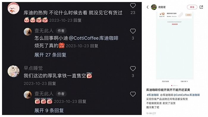 在频繁推出联名以前,库迪就曾因店内热狗、厚乳拿铁等产品时不时断货或者过早售罄引发过消费者的不满,直呼“烦死了”。