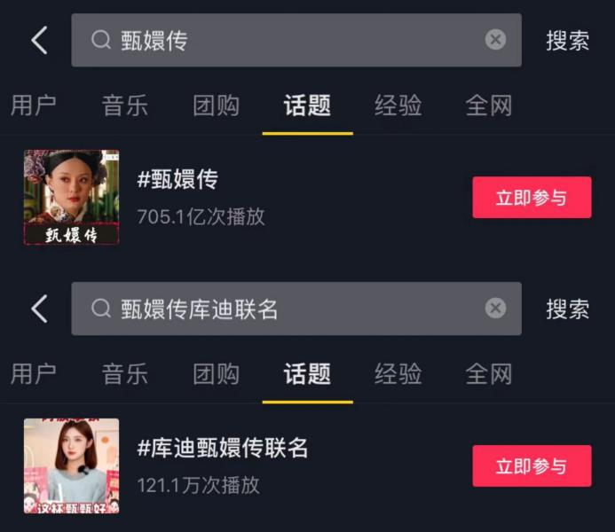 在电视剧讨论热度相对较高的抖音平台,#甄嬛传已超700亿次的播放量与#库迪甄嬛传联名刚过百万次的播放量,实在相去甚远。
