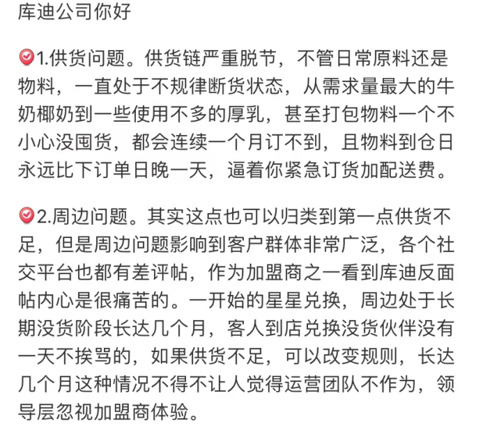 在前段时间热度较高的《致库迪咖啡公司管理的另一封信》里,该联营商就明确指出过周边缺货的问题,并表示,“周边问题影响到的客户群体非常广泛,客人到店兑换没货,店里小伙伴没有一天不挨骂的。”他认为“库迪领导层忽视加盟商体验”。