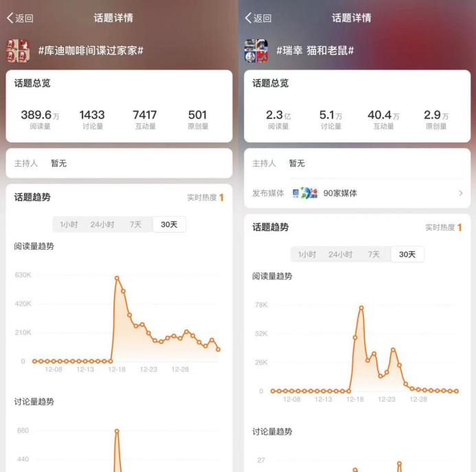 像是同样联名动画IP的瑞幸选择的就是国民度明显更高的《猫和老鼠》,在社交平台微博的话题广场,二者相关话题的热度差异十分明显。截至目前,#库迪咖啡间谍过家家#话题总阅读为389.6万,#瑞幸 猫和老鼠#话题总阅读则以达到2.3亿。