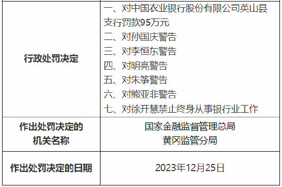 1月4日金融一线消息,国家金融监督管理总局黄冈监管分局行政处罚信息公开表显示,中国农业银行股份有限公司英山县支行因员工行为管理不到位、柜面业务操作不规范,被国家金融监督管理总局黄冈监管分局罚款95万元;五名相关责任人被警告,一名相关责任人被禁止终身从事银行业工作。