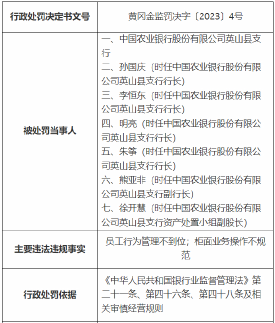 因员工行为管理不到位等 农行英山县支行被罚95万元