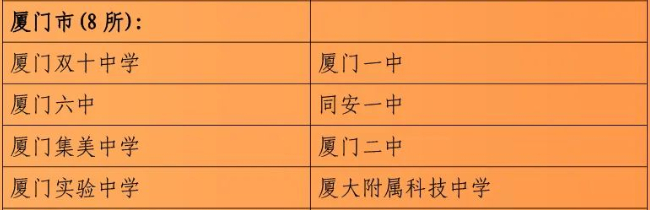 厦门(5所):厦门一中、厦门双十中学、厦门外国语学校、厦门六中、厦门集美中学
