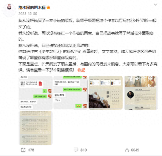 12月30日,周木楠回应:“我从没听说买了一本小说的版权,就等于顺带把这个作者以后写的一起买了的。”周木楠公开了自己从同行朋友那里收到的来自年年剧制的《少年歌行2》策划书。策划书中《少年歌行》此前的真人网剧、动画、小说都作为IP宣传的亮点,还给出了故事梗概。但实际上《少年歌行2》的小说周木楠只写了个序章,故事梗概无从说起。“我看完梗概惊掉了下巴,原来他们不是要没有授权拍《南明离火》,而是要自己编一个《少年歌行2》。我更加震惊,没想到还有这个操作!”周木楠将中影年年的《少年歌行2》定义为“自己写一个2,重新找一些演员,另外寻觅导演,纯纯的侵权山寨版。”