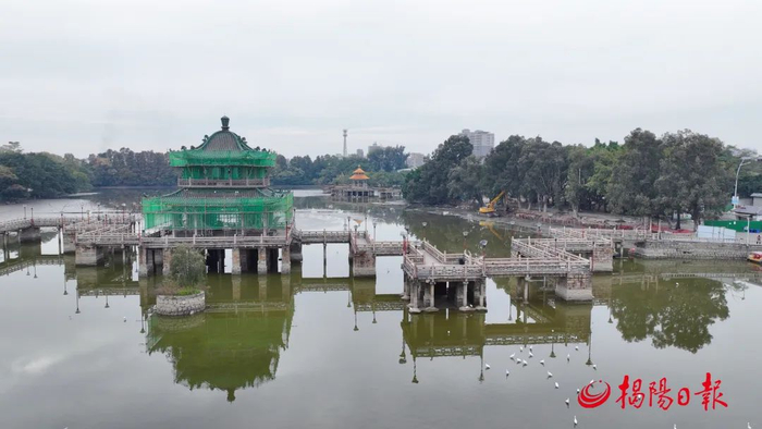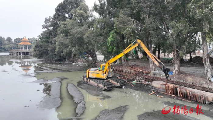 记者近日在项目施工现场看到,施工人员有的在对已抽干水的西湖进行清淤,有的进行入口处道路施工,有的在搬运修缮九曲桥石亭所需的建筑材料,一派繁忙有序的施工景象。据揭阳古城建设投资发展有限公司董事长林晓冬介绍,沿江片区文化旅游项目(西湖公园)岸陆面积约8.2万平方米,水体面积约10.46万平方米,建设内容包括入口改造、仿古建筑湖心亭九曲桥石亭修缮、道路铺装改造、配套驿站厕所、停车场、水质改造设施及驳岸改造、给排水改造、电气工程及绿化等。目前,公园入口、荔园广场、情景表演剧场改造提升工程以及西湖原有水体整治工程等部分节点施工正有序推进,力争在2024年春节前完工并向市民开放,中心大舞台、西湖东片区改造提升工程将持续至2024年年中完成。