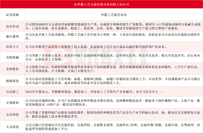 除了新坐标、恒锋工具和思进智能,据财联社不完全梳理,浙江黎明、津荣天宇、奇精机械、金钟股份、精锻科技、百达精工、正强股份、安洁科技、远东传动和大富科技等上市公司亦有冷锻工艺相关布局,具体情况见下图: