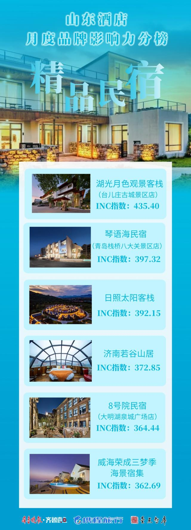 山东酒店月度品牌影响力分榜单(11月)显示,精品民宿TOP6为湖光月色观景客栈(台儿庄古城景区店)、琴语海民宿(青岛栈桥八大关景区店)、日照太阳客栈、济南若谷山居、8号院民宿(大明湖泉城广场店)、威海荣成三梦季海景宿集。其中,济南2家,青岛1家,威海1家,枣庄1家、日照1家。亲子酒店TOP6为青岛金沙滩希尔顿酒店、青岛鑫江温德姆酒店、济南融创施柏阁酒店、烟台龙湖假日酒店、青岛融创施柏阁酒店、蓬莱欧乐堡骑士度假酒店。其中,济南1家、青岛3家、烟台2家。温泉度假酒店TOP6为商河温泉酒店、威海汤泊温泉度假村、临沂鲁商知春湖温泉酒店、临沂观唐温泉(国际)度假村、临朐揽翠湖(天沐)温泉度假村、齐河孔雀王蓝海御华温泉酒店。其中,济南、威海、潍坊、德州各1家,临沂2家。