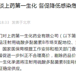 2024年1月4日,据国家医保局最新消息,违规药企再被约谈,上药第一生化承诺将注射用硫酸多黏菌素B挂网价格从270元/支进一步降低至123元/支,并保证稳定供应。