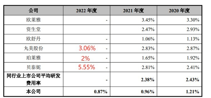 正是由于毛戈平重点关注产品设计和化妆形式的创新,其在行业内的研发水平同样处于偏低位置。