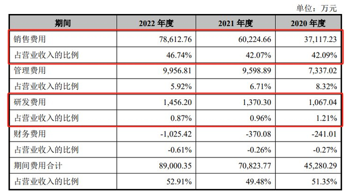 由于销售员工薪酬开支、广告费用投入以及宣传费用增长,毛戈平销售费用占营收比例也从2020年的42.09%增长至2022年的46.74%。毛戈平也在招股书中表示,能否有效控制销售费用支出规模,发挥销售投入对未来销售的促进作用,对公司经营业绩将带来较大影响。