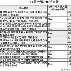 上海市消保委查看样品的配料表,发现大多数泡腾片中都会加入碳酸氢钠或碳酸钠,这都在无形中增加了钠的摄入。