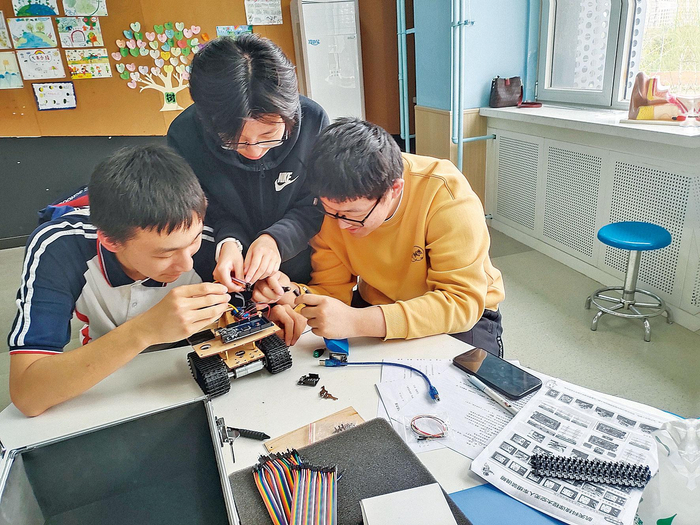 北京理工大学附属实验学校学生进行航天科技课程太空无人车组装