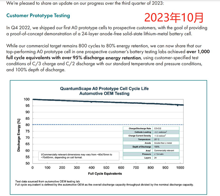 顺便一提,在同一份股东信中,QuantumScape也表示公司最终的商业化目标是充放电800次后,电池依然维持80%的容量。