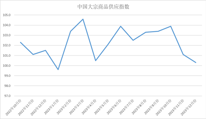 由中国物流与采购联合会调查、发布的2023年12月份中国大宗商品指数(CBMI)为100.7%,较上月回落0.6个百分点,指数连续三个月出现回落。分项指数显示,销售量、供应量均呈上升走势,供应量升幅有所收窄,库存量呈下降走势;从市场来看,对一些大宗商品的冬储需求拉动了销售指数的上涨,但反弹动力仍显不足,后续虽仍有补库空间,但幅度不及往年正常年份。从供应端来看,由于新冠疫情的反复、全球产业链的中断和极端天气的频发,大宗商品的供应受到影响,导致能源市场供应偏紧及工业品供过于求。综合来看,当前国内大宗商品市场供应宽松,市场情绪谨慎。后期来看,进入1月份,随着前期宏观利好消息被市场逐步消化,叠加多地天气将处于一年中最冷的时候,市场需求将继续下降,加之春节临近,终端企业需求将有所放缓,贸易商也将逐步季节性离市,整体交易活跃度下降。同时由于资金压力趋于加大,供方为了回笼资金,会有意加快出货速度,大宗商品价格走势趋于走低。