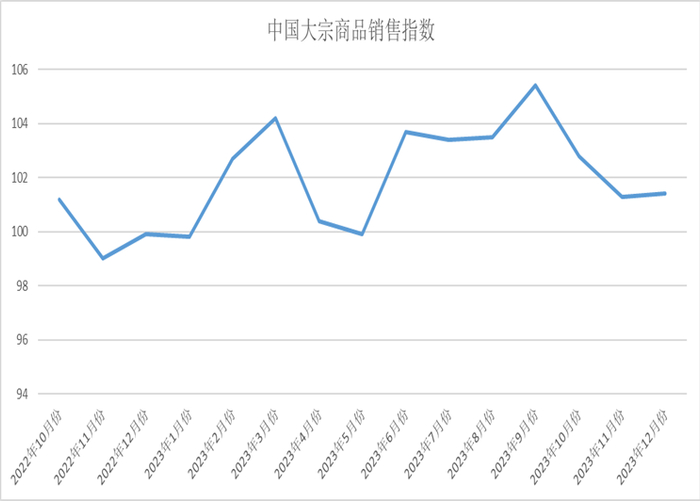 2023年12月份,大宗商品销售指数小幅回升0.1个百分点,至101.4%,显示企业的冬储行为及节前消费端备货为大宗市场需求端提供支撑,销售指数上涨,但受制于大宗市场行情低迷,企业冬储的热情不及往年,且加之部分地区疫情反复,持续降雪,又进一步影响了市场需求,终端企业采购越发趋于谨慎,本月销售指数增速仅表现为小幅回升。各主要商品中,铁矿石、原煤、有色金属和汽车销售量继续增加,增速继续加快;化工销售量均有所增加,但前期石化产品价格上涨主要在于成本和供给层面的驱动,随着驱动力的边际弱化,以及价格上涨之后的传导逐步出现阻力,后期价格上涨恐难持续,故销售增速有所减缓;钢铁方面,12月是钢铁行业的传统淡季,今年大范围暴雪寒潮天气使得多地气温骤降,也加快了钢市需求衰减的步伐,整体需求进入了季节性衰退期,市场销售量出现下降;成品油方面,进入12月,需求依旧平淡,且出口量受阻,对炼厂开工仍有制约,导致成品油销售量下降。