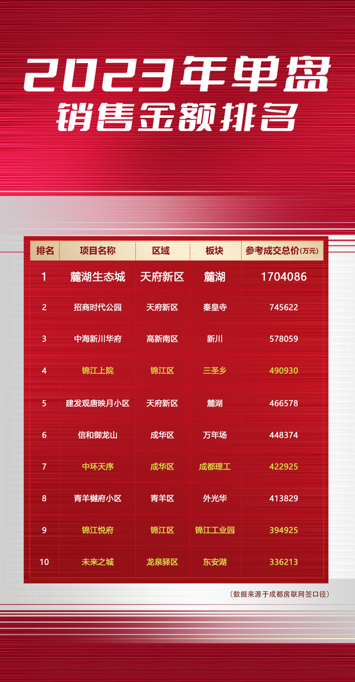 而在2023年成都单盘销售金额TOP10 中,华润置地则独占4席。(锦江上院、中环天序、锦江悦府、未来之城)