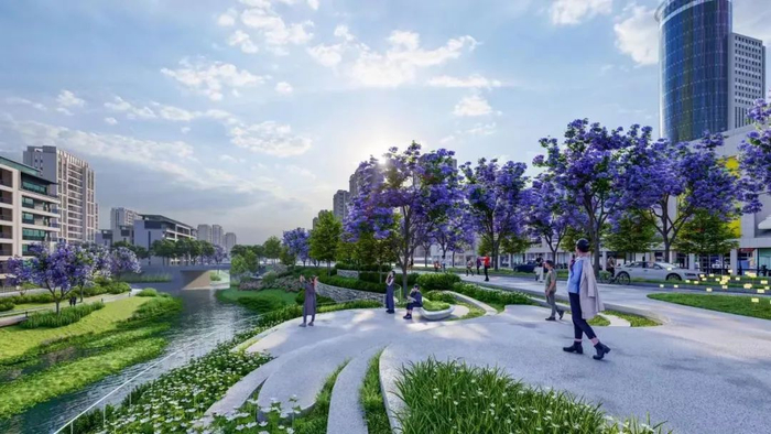 从总平图来看,上璟润府由一条溪谷穿城而过,串联起7个地块,大片的绿地公园(约128亩)映入眼帘,在华润置地妙笔之下,地块不是分散的各个功能体之间的堆砌,而是有机聚合,所有的资源被链接为一个整体。