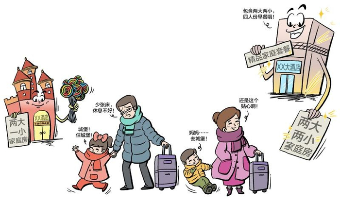 风景美图搭配着“超值、特惠”的套餐价格,层出不穷的酒店产品纷纷“热推”,令人眼花缭乱。细看这些套餐,主打家庭亲子游的,多以“两大一小”作为人数限制,让一些二孩家庭犯了难。“总不能留一个孩子不带,超出的‘一小’怎么办呢?”