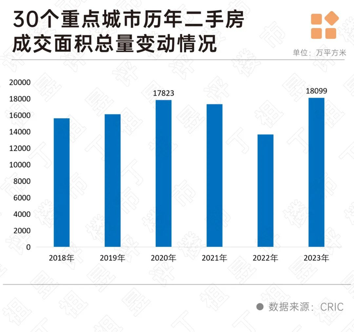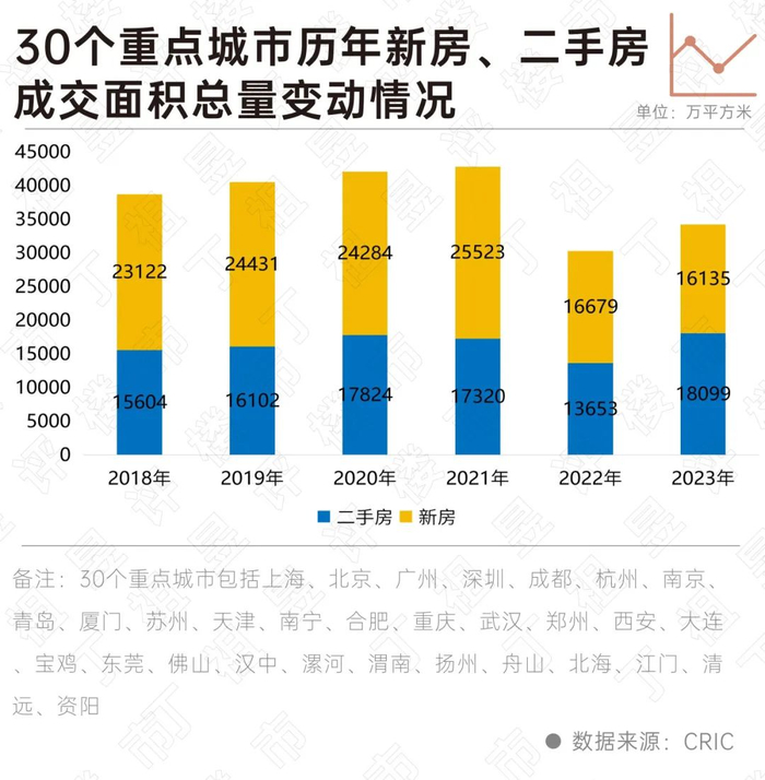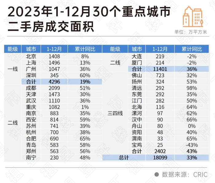 CRIC数据显示,去年全年重点30城一二手房成交总量为3.43亿平方米,同比增长13%。
