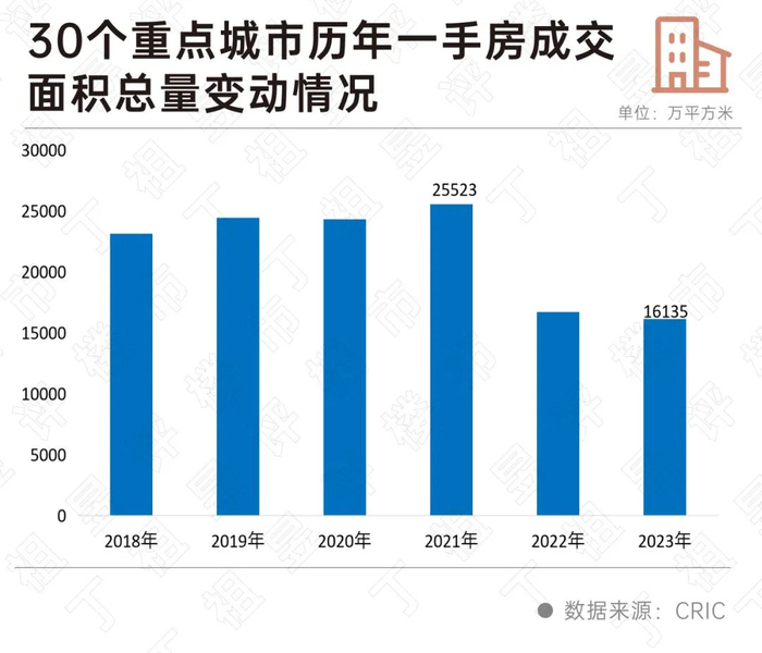 具体来看,重点30城一手房成交面积为1.61亿平方米,同比减少3.3%。这一数字在2021年时是2.55亿平方米。