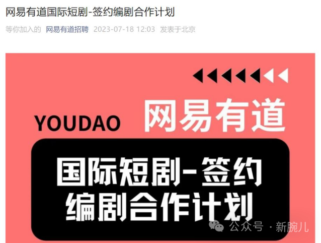 在今年7月,网易有道公众号发布了「国际短剧-签约编剧合作计划」,向全球招募短剧剧本编剧,而网易将开放全网IP支持短剧。