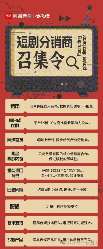 网易新闻发布「短剧分销商召集令」,合作协定态度鲜明,向分销商承诺:信用、高分成比例、同步首发、拒绝投放内卷、重点项目背书、日结周期、配额、技术支持和专业水平。