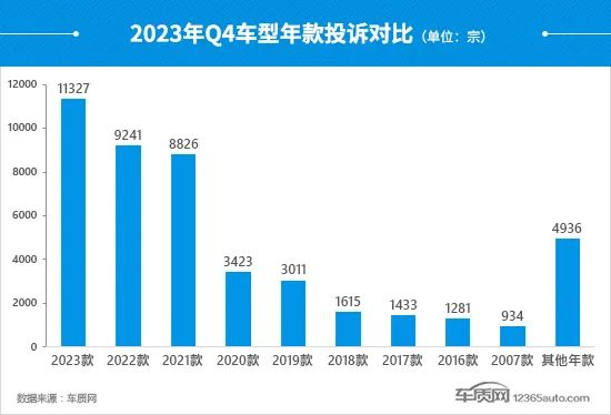四季度,2023款车型一跃成为投诉主体,投诉量首次突破万宗,环比上涨65%。此外,2016款、2019款和2020款车型的投诉量也出现了小幅增长。相比之下,2022款和2021款车型“退居二线”,投诉量双双回落至万宗以下。